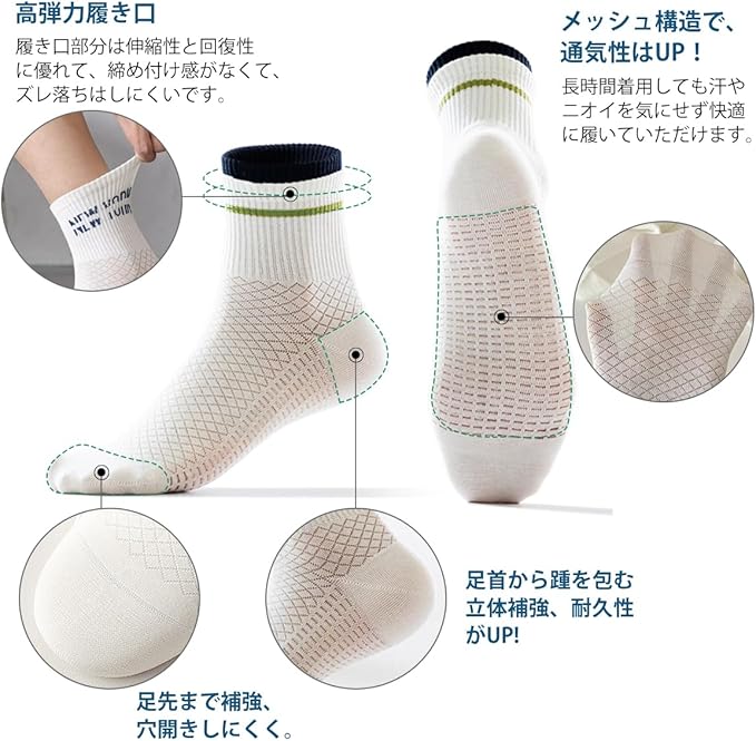 【伸縮性が優れた、履心地が良い】:伸縮性のあるゆったり履き口、一日履いでもむくまなく、疲れが溜めない滑り止めメンズ靴下です。 つま先とかかと部分を補強してずれにくく、足にしっかりとフィットして、耐摩擦性が高く、衝撃を受けた時足を守ることもできます。