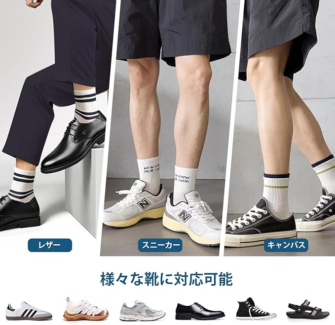 【お洒落スポーツ風とビジネスソックス】:コントラストカラー配色やストライプなどのファッション要素があるシンプルなデザインと落ち着いた5カラー展開で、靴を脱いでもカジュアルでファッショナブルな雰囲気を演出できます。ビジネス、スポーツスやカジュアルなどのスタイルにも合わせやすいファション靴。あらゆる種類のスポーツシューズ、キャンバスシューズ、ローファー、サンダル、スリッパ、マーティンブーツなどに適しています。マルチカラーの変更により、毎日違う靴下を選ぶことができ、毎日履くのに飽きることはありません。