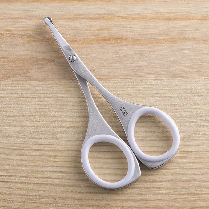 女性向けの指穴サイズで、すべりにくい樹脂リングを装着した金属の鼻毛用ハサミです。