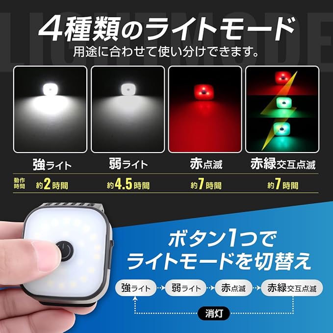 多彩な照明モード: ハイライト、ローライト、レッドストロボ、レッド/グリーンスイッチングストロボモードからニーズに合わせて選べます。格安ライトにありがちなSOSリズムではなく、単調なストロボ点滅なので、山間部や海沿いでも、どこでもお使いいただけます。