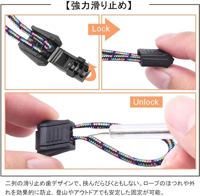 【強力滑り止め】二列の滑り止め歯デザインで、挟んだらびくともしない。ロープのほつれや外れを効果的に防止,登山やアウトドアでも安定した固定が可能。