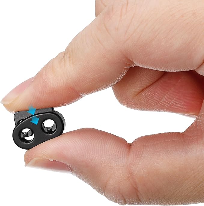 【スプリングロードデザイン】- アロイ製のダブルホールコードロックは、コードをロックして便利に使用するためのもので、紐を切ることはありません。スプリングが内蔵されており、コードをしっかりと締め付け、紐やドローストリングの滑り落ちを防ぎます。