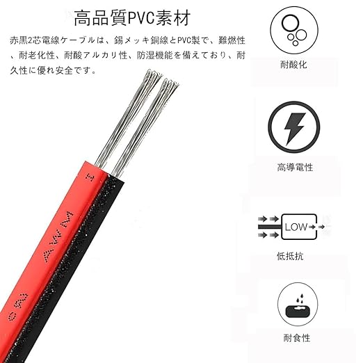 【セット内容】シリコーンゴムジャケットに0.3mm の高純度無酸素錫メッキ銅線、2芯並列設計(黒・赤各20m)、柔軟性と耐久性を考慮。