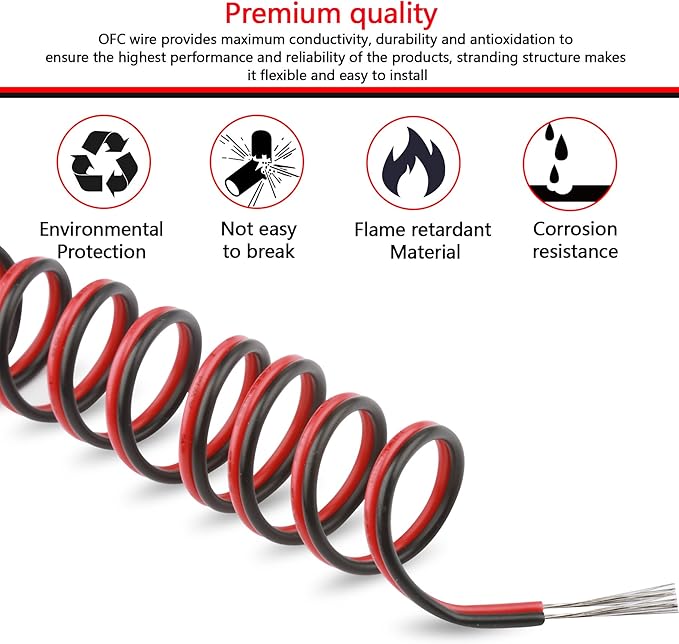 プレミアム品質: ワイヤーの区域は0.82mm2(0.16mm x 41の繊維)、それは18 AWGの標準(0.81mm2)より大きい、OFCワイヤーはプロダクトの最高の性能そして信頼性をするために最高の伝導性、耐久性および酸化防止を提供します それは適用範囲が広くそして容易に取り付けます、低電圧ワイヤー、12vワイヤーおよび自動車ワイヤーに関しては完全な18のゲージの電気ワイヤー