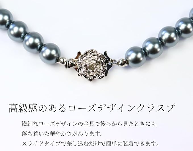 【高品質の日本製!】素材、金具、組み付けともに国内の職人が自社手作業で生産しております。カラーはシルバーブラック(慶事用などのフォーマルシーンにおすすめ)です。また、耐久性に優れている日本製の糸を使用しています。糸をパール珠に二重にして通しておりますので、更に丈夫に仕上がりました。永くご愛用いただけるアイテムです。