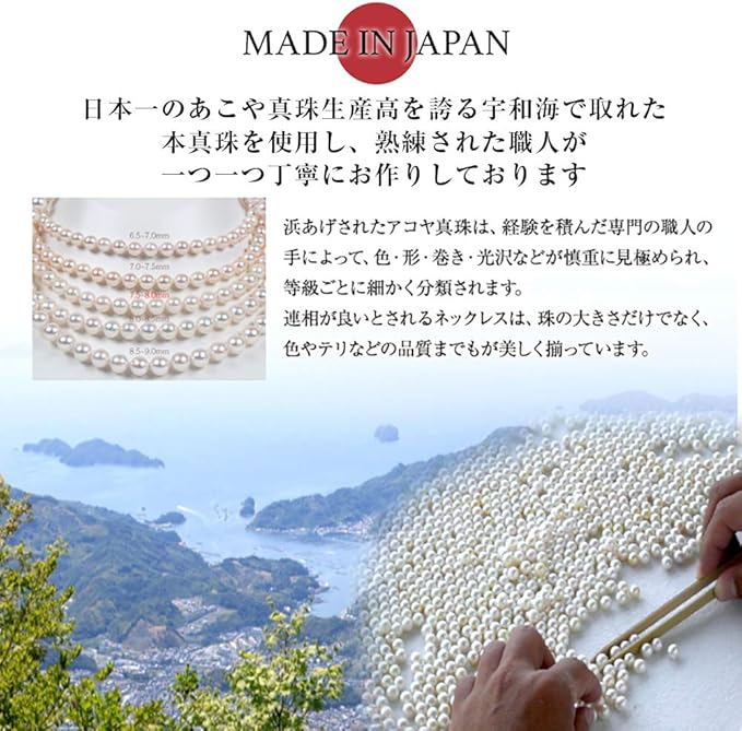 【日本が世界に誇る宇和島産 本真珠】長い歴史と熟練された職人による丁寧な作業が美しい秘訣の真珠ネックレス。あこや真珠の最高品質「花珠真珠」はわずか1/200しかとれないと言われる希少な輝きを持つ真珠です。