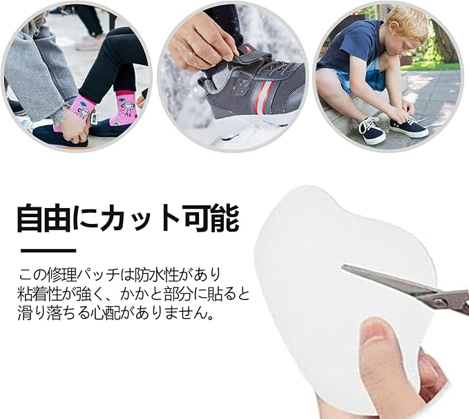 【自由にカット可能】この修復パッチは厚さ約1mmと薄型なので、さまざまなサイズや形にカットしたりすることができ、靴に合わせて自由にカット調整できます。貼る前に一度かかとに当ててサイズを見て、大きい場合はハサミで適切にカットしてください。