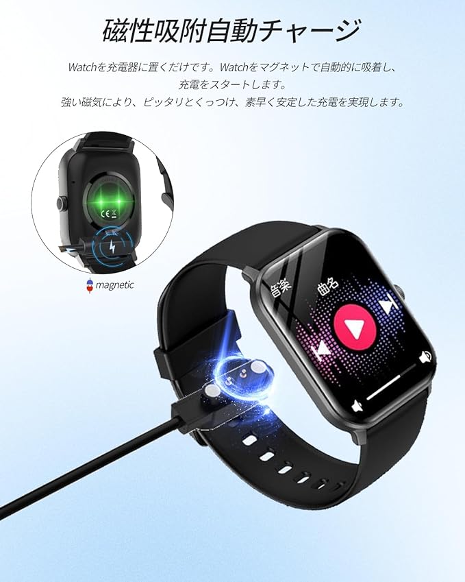 【磁気充電型&使用簡単】この時計充電器は、磁気と誘導充電技術を組み合わせたものです、付属のUSBコードを電源に差し込み、充電器にウォッチを置くだけで自動的に吸着して充電が始まります。ぴったりに吸着し、角度を自由に置いても充電器の中心から離れず、充電中の落下を防ぐこともできます。