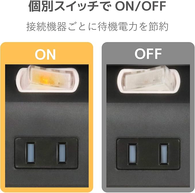 接続機器ごとにON/OFFでき、待機電力を個別に節約できる個別スイッチが付いています。