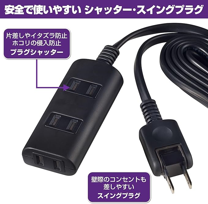 ●180 回転プラグ。耐トラッキングカバー付。 ●熱に強い。 ●使用していないコンセントの刃受口を封じて幼児のいたずらによる感電予防となります。 ●安全の保護被ふく