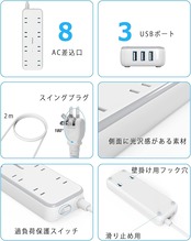 「一台11役・USB付き・2m延長コード」これはAC差込口8個口とUSBポート3口が一体となったのテーブルタップです。まとめて11台の機種が同時に充電で、コンセント不足が解決できます。在宅勤務、オフィス、会議室、寮など複数な設備を使用場所に活用できます。