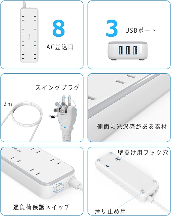 「壁掛け用電源タップ」壁等に仮固定できるフック穴付き、壁にかけてご利用できます。省スペースで、配線もスッキリになります。テーブルタップの底の四角にゴム製の滑り止めがついており、卓上で安定感があります。両立な使い方あり、お客様に心地よい生活を与えます。