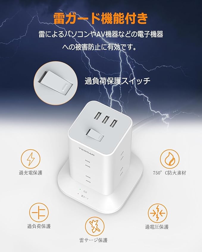 【雷ガード機能付のたこ足コンセント】雷ガードLEDインジケータが付いて、サージ保護機能が正常に動作している場合に点灯します。高性能雷サージ吸収素子(バリスタ)を内蔵していますので、雷によるパソコンやAV機器などの電子機器への被害防止に有効です(サージ保護機能が正常に動作している時に赤ランプが点灯します)。