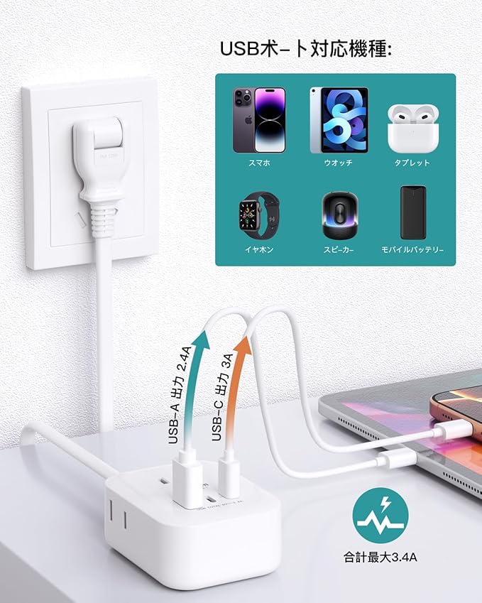 【干渉しづらいデザイン】ACコンセントを2方向に分配して、どちら側からも気軽にケーブルを挿すことができます。USBポートの総出力は3.4Aで、単一ポートの最大出力は3Aです。USBポートは接続されたデバイスの種類を自動的に検出し、各デバイス(スマートフォンやタブレットなど)に最適な出力で充電します。また、180 スイングプラグを採用して、狭い場所でも配線しやすい。(PD非対応で、急速充電機能もありません❕❕)