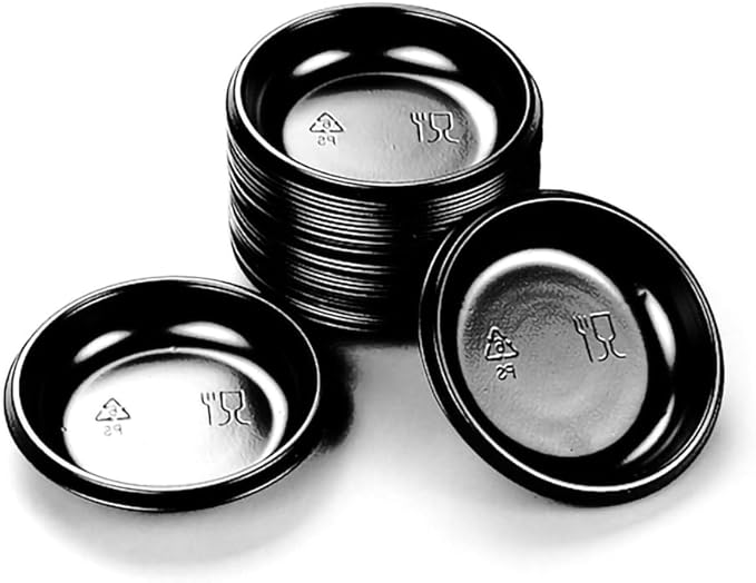 ICSTM 使い捨てソース皿 100個 プラスチック 使い捨て ラウンド ブラック ディップソース皿 調味料大皿 醤油皿 寿司 マスタードビネガー ソイ BBQ ケチャップ用
