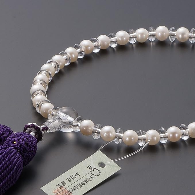 珠の素材:淡水パール(真珠) 6mm玉/主珠…淡水パール6mm玉/本水晶 みかん玉6mm 3mm玉/親珠…本水晶10mm玉/房の素材:正絹頭付房(紫紺色)/備考:数珠袋付き(縦9.5cm 横15cm)、数珠は桐箱入り