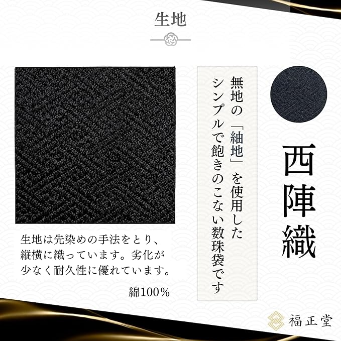 ※サイズ 9.3cm 14.3cmです。 主に女性用の数珠入れです。主玉12mm以上の大きめ数珠には対応しておりません。 ✅【1500年の伝統「京都・西陣織」】こちらの数珠袋は、国の伝統的工芸品に指定の京都素材を京都の職人が、伝統的なこだわりを持って制作しています。海外製品とまた一味違う気品がある黒です。