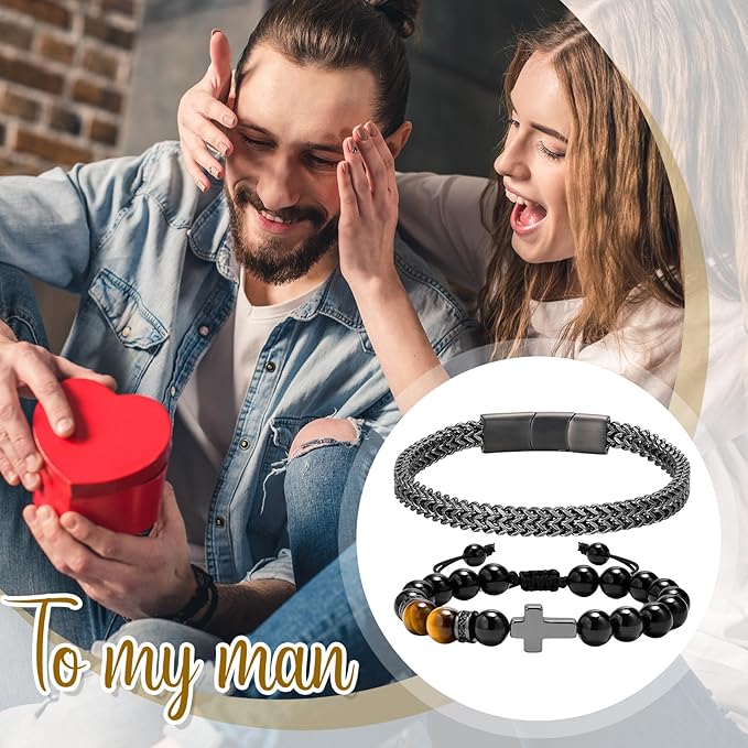 メンズ対応、彼氏へのバレンタインデー プレゼント 男性 タイガーアイ ブレスレット 十字架 2点セット カード付き クロス ビーズ 数珠 念珠 腕輪 天然石 ステンレス メンズ アクセサリーです。シンプルながら存在感もあります。