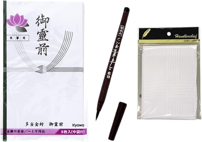 【弔事3点セット】香典袋(御霊前)+薄墨筆ペン+白ハンカチ|お葬式 法事 法要 葬儀 冠婚葬祭+マナー&相場ガイド付き