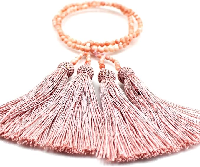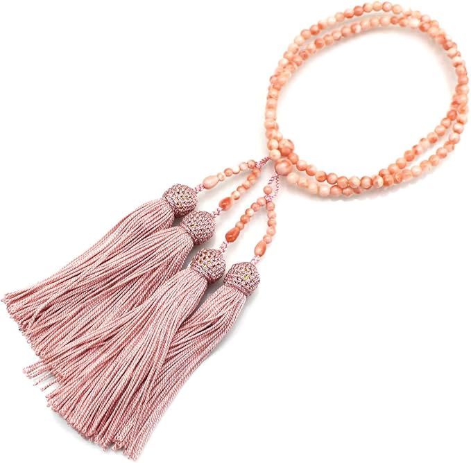 【サイズおよび素材】●素材:深海珊瑚 直径約5.2ミリ 親珠(約8ミリ)、四天珠(約4ミリ) ●サイズ:長さ約55センチ ●金具:房 正絹