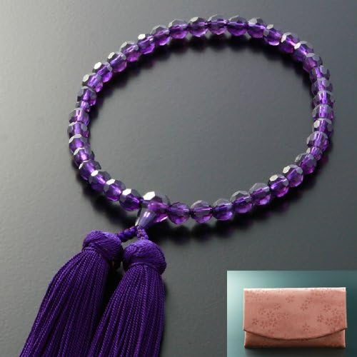 主玉:紫水晶 切子玉 7mm, 親玉:紫水晶 切子玉 , 二天玉:紫水晶 切子玉 , 房:みやこ房(正絹)紫紺色/箱:桐箱入り/宗派:宗派用/セット品:数珠袋(清滝 灰桜色 16cm 8cm)