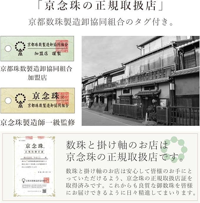 京念珠製造の証として、京都数珠製造卸協同組合のタグ付き。
