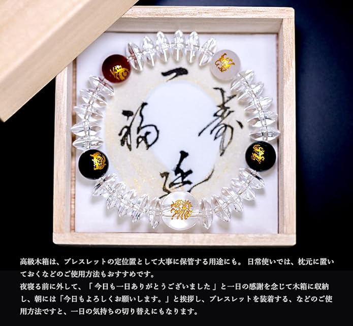 セット内容:ブレスレット + 一福延寿 短冊 + 高級木箱 ずっとお使いいただけるように、高級木箱が付属致します。自分用にはもちろんのこと、「成人のお祝い」「新社会人の贈り物」など、ギフトとしても最適です。