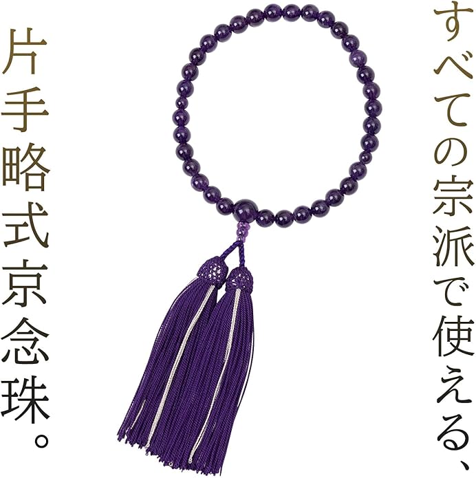 【 珠の素材とサイズ 】 主珠:紫水晶 8mm玉 親珠:紫水晶 12mm玉 天珠:紫水晶 6mm玉 【 房 】 正絹2色房(紫紺に銀ライン) 【 セット内容 】 本体 + 証明書 + 紙箱