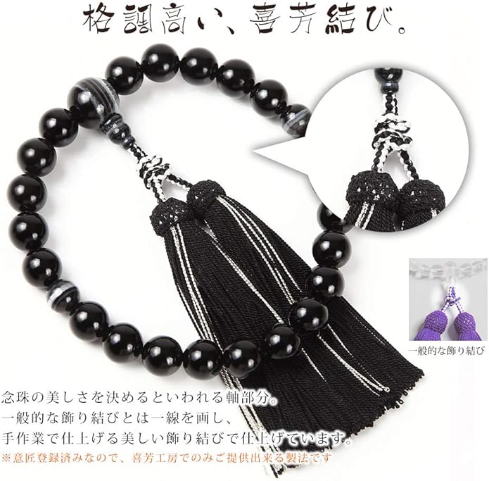 男性に圧倒的な人気のある黒オニキスです。 黒縞瑪瑙をアクセントに、漆黒の艶が美しいオニキスがかっこよくお洒落なお念珠になっています。