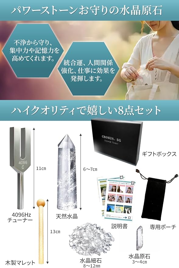 ✅【充実の6点セット 】4096Hz クリスタルチューナー、水晶柱(ブラジル産約6cm〜7cm)、浄化用天然水晶さざれ(カット天然水晶)、木製マレット(約15cm)、収納ポーチ、水晶原石