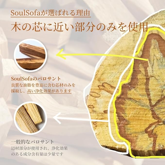 【 神聖な起源 ペルー産の恵み】南米で“聖なる木”として親しまれてきたパロサント。 古代から空間の浄化や魔除けに用いられ、現在でも多くの人々を癒し続けています。 SoulSofaでは100%ペルー産にこだわり、エクアドル産に比べて大ぶりで油脂分を多く含む木材を使用。 現地の正規農家とフェアトレードを実施し、自然倒木のみを加工したサステナブルな素材です。
