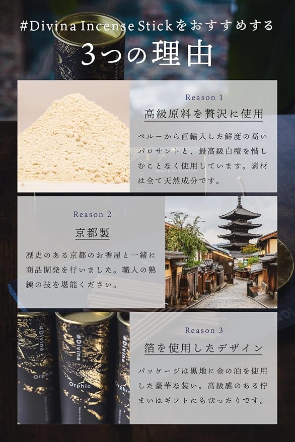 伝統と革新: 京都で製造された、伝統的な技術と現代的なデザインが融合したプレミアムなお香です