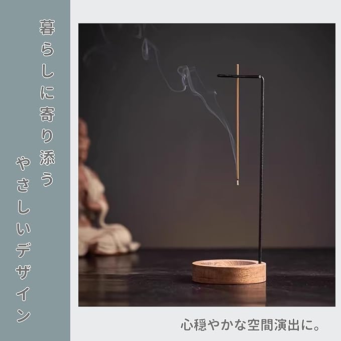【灰が散らからない吊り下げ式お香立て】吊り下げタイプのお香立ては、お香を宙に吊るして燃焼させる構造。灰は真下の木製台座に自然と落ちるため、周囲が汚れにくく、掃除の手間も最小限に。使うたびの片付けが簡単なので、毎日のリラックスタイムにもストレスなく使用できます。お香初心者から上級者まで幅広くおすすめ。