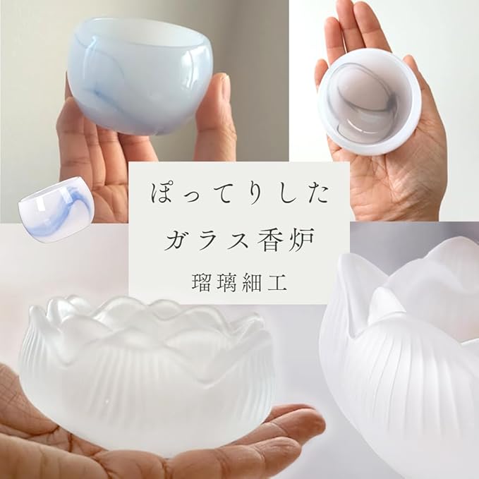 【質感の良いミニ香炉】厚手のぷっくりとしたガラス製の香炉。安定感があり、現代的な住宅にも、モダンなリビングにも、ヨガにも、ミニ仏壇にも良く合う香炉です。付属の香立ては、金属製で、灰を入れなくてもお線香を立てて使用できますので便利です。3タイプの穴があいており、細いお線香や短いお線香などと相性が良い、使い勝手の良い製品です。