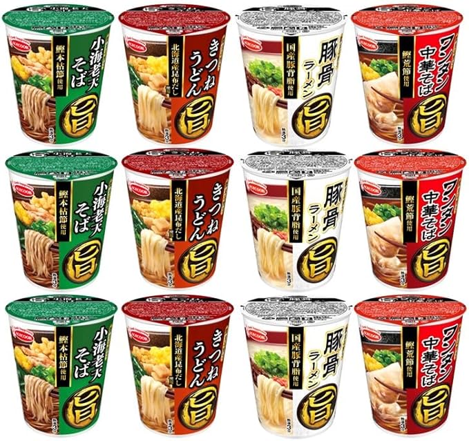 (小海老天そば):エネルギー:256kcal、タンパク質:7.0g、脂質:10.0g、炭水化物:34.4g、食塩相当量:3.2g (きつねうどん):エネルギー:268kcal、タンパク質:5.2g、脂質:11.2g、炭水化物:36.5g、食塩相当量:3.5g (ワンタン中華そば):エネルギー:242kcal、タンパク質:5.8g、脂質:7.0g、炭水化物:39.0g、食塩相当量:3.3g (豚骨ラーメン):エネルギー:255kcal、タンパク質:5.6g、脂質:9.3g、炭水化物:37.1g、食塩相当量:3.2g