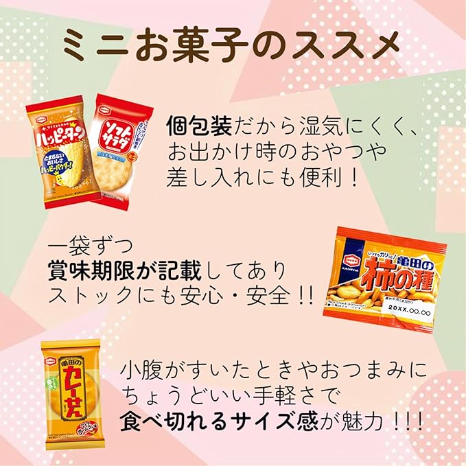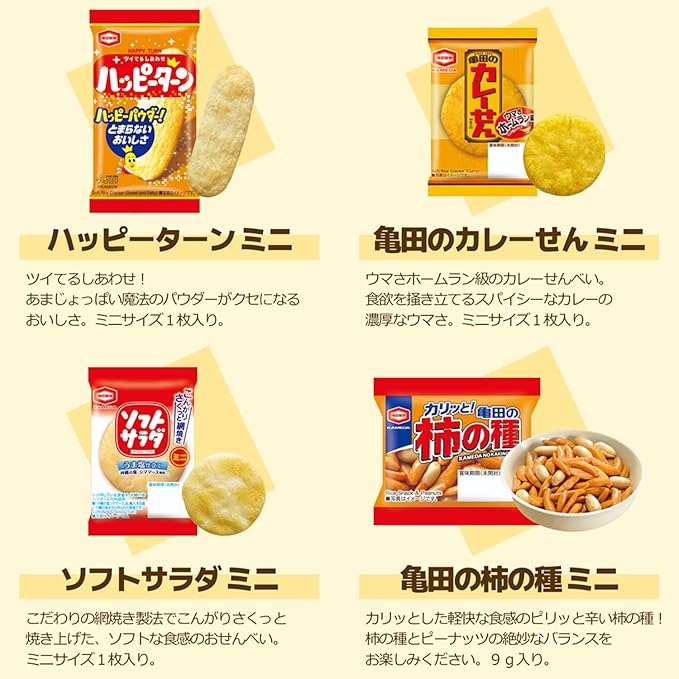 【セット内容】ハッピーターン(4g)20個、亀田のカレーせん(2.7g)20個、ソフトサラダ(2.6g)20個、柿の種 (9g)20個、ぽたぽた焼き (1枚)10個、揚一番(1枚)10個