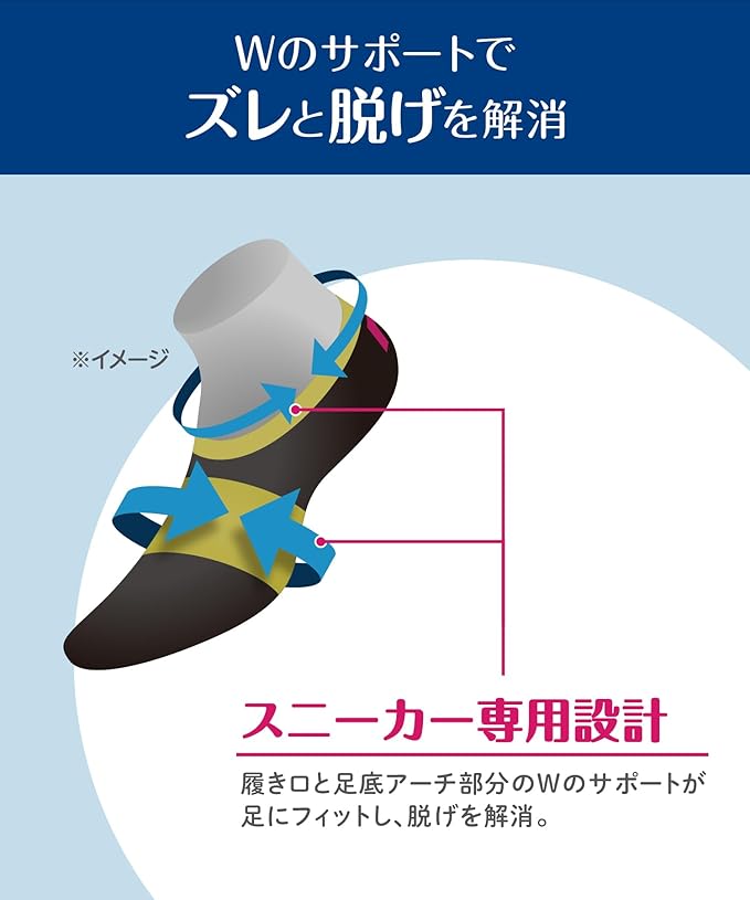 【スニーカー専用設計】口ゴムと足底アーチ部分のWサポート仕様で足にフィット。