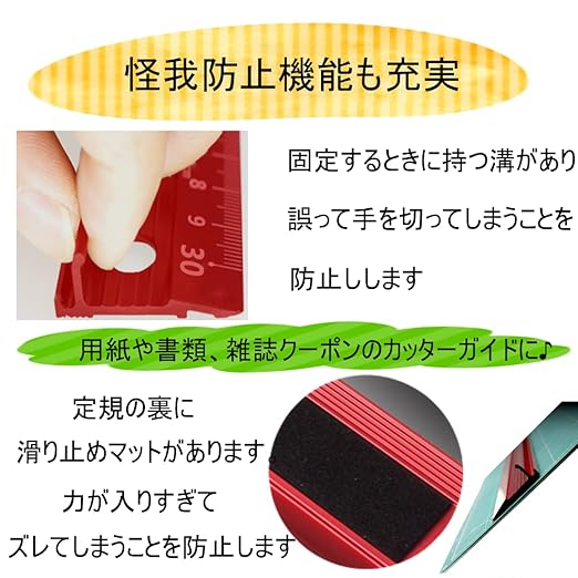 【製図、デッサン、カッターガイドに】定規接地面にはずれないように滑り止め加工がされています。定規表面には安全性が考慮された持ち手がついておりカッターガイドとして使用する際に手を傷つける心配がありません。