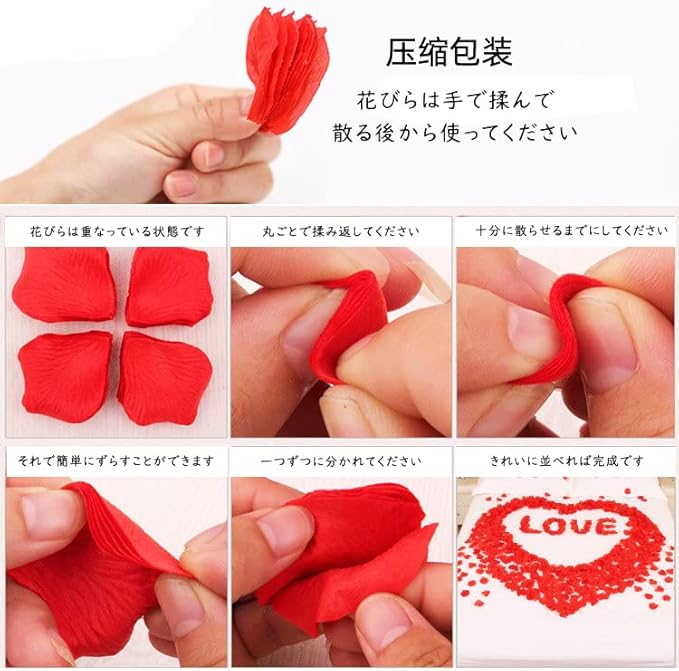 【ご注意】:花びらは圧縮包装されているので、使用する前に分ける必要があることに注意してください。人工包装のため、数量や色で少々の誤差があるかもしれないのでご了承ください。もしも包装・運送工程で商品が使用不可の場合、気楽にご連絡してくださいませ。、または返金のご案内を致します。