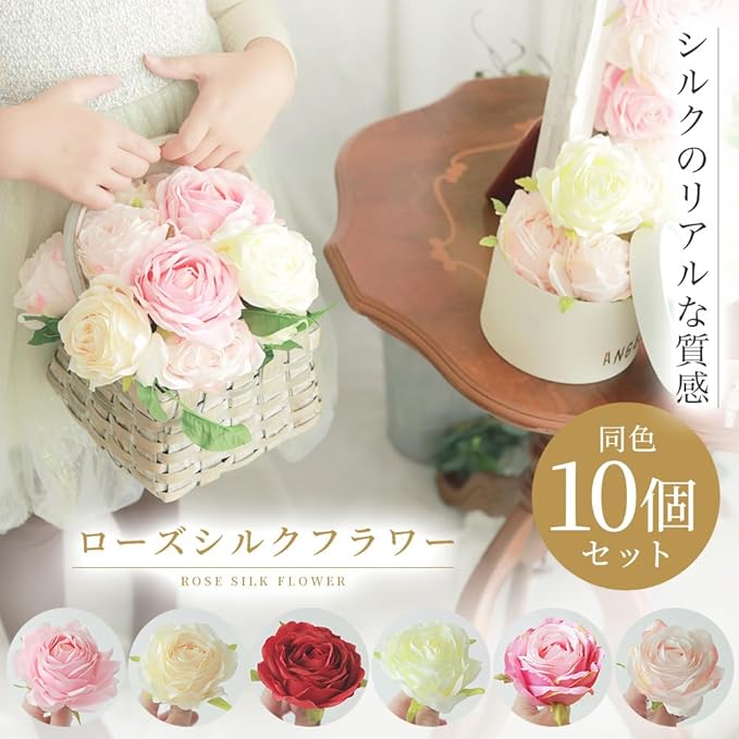 【バラのお花】茎部分がないお花部分だけのシルクフラワーはDIYやハンドメイド制作で非常に使いやすく、重宝されています。単色カラーの10個セットですので、コーディネートしやすくイメージ通りに仕上がるのが魅力の大輪のばらです。