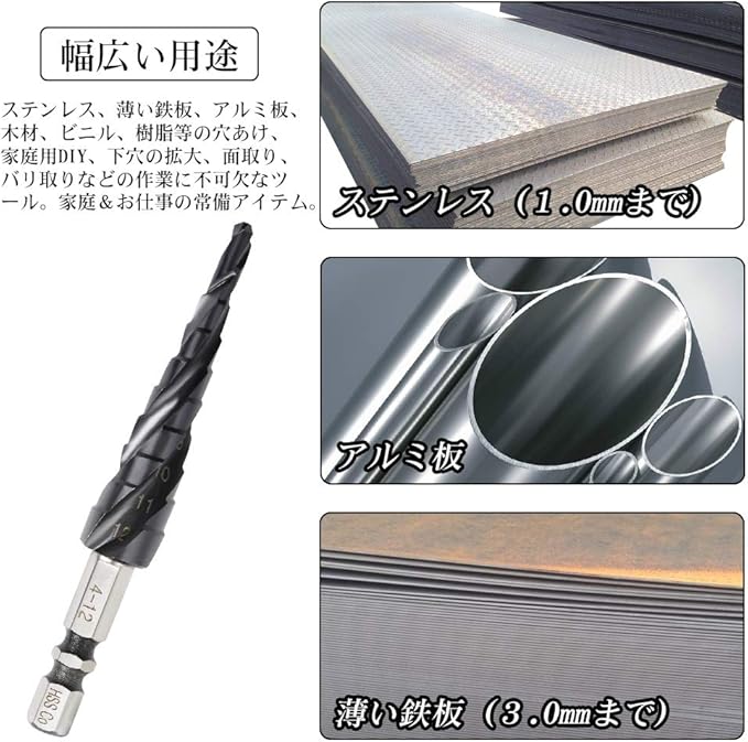 【適用範囲】:ステップドリルは小さな穴から、大きな穴まで順に穴を広げていくため、複数サイズの穴あけと穴の拡大修正が可能です。また軸の形状が六角軸なので、インパクトドライバー・電気ドリル・充電ドリルでも使用できます。