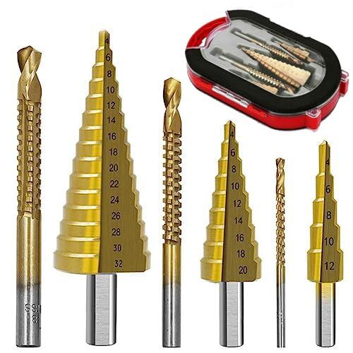 【6点セット ドリルビット】チタンメッキステップドリル4-12、4-20、4-32mm各1本、チタンメッキツイストドリル3、6、8mm各1本。穴あけ・下穴の拡大・面取り・バリ取りなどの作業がこのセットで全て可能に!