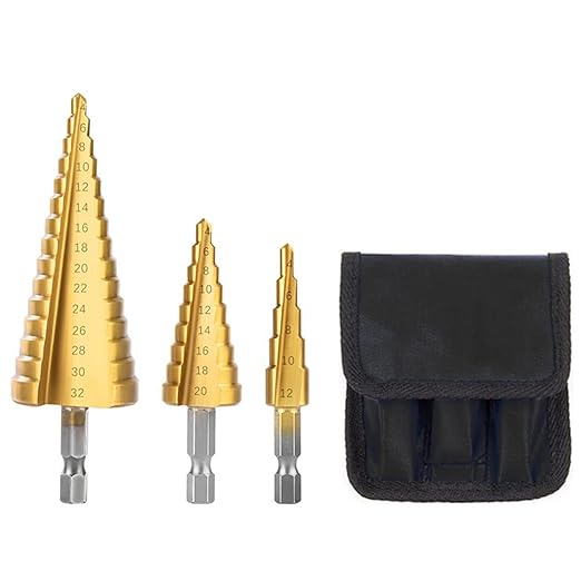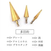 【ステップドリル】:ステップドリルはわずか1本でさまざまな規格とサイズの穴を開けることができます。ステップドリルの3本セットは普通のドリル1箱に相当し、非常に便利です。
