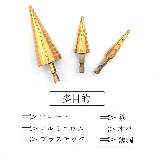 【材質】:本体はHSS鋼4241で、表面はチタンコーティングの処理され、普通の鋼製のステップドリルより硬度が高く、切れ味も抜群です。