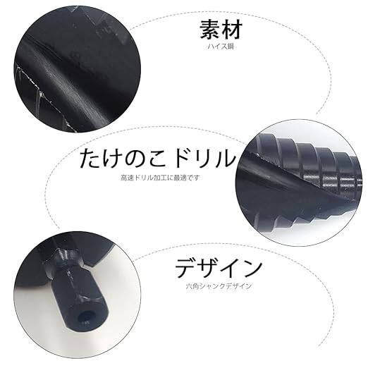たけのこドリル: 高い安定性と長寿命は注目されるポイント!たけのこドリルは小さな穴から、大きな穴まで順に穴を広げていくため、複数サイズの穴あけと穴の拡大修正が可能です。ミリ表示によって、作業の精度を向上させます。汎用六角軸仕上げで、電気ドリル、充電式ドリルドライバー、インパクトドライバーなどに適します。