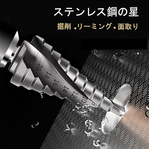 超硬ステップドリル: 超硬コバルトハイス鋼素材を採用して、耐摩耗性と耐熱性があり、普通の鋼製ステップドリルより抜群な切れ味です。