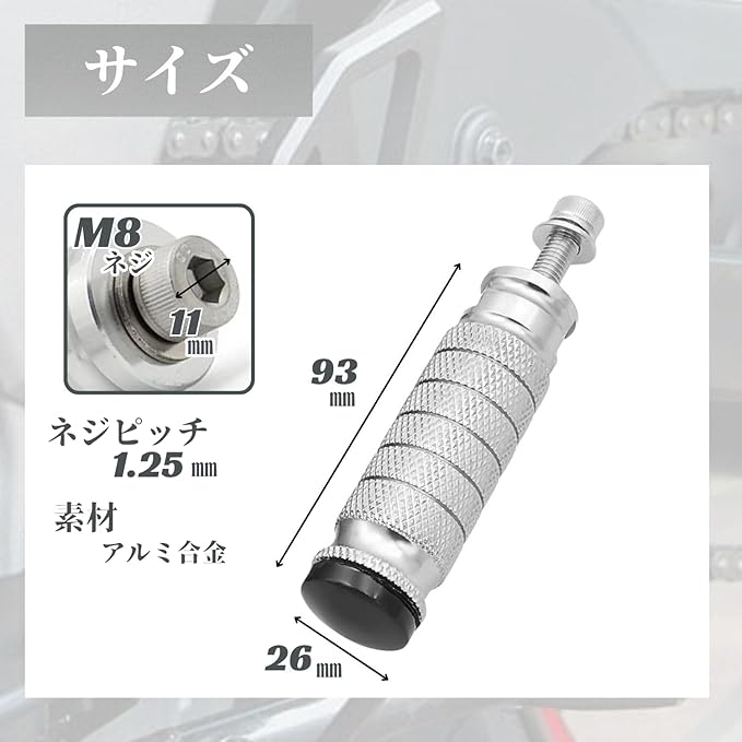 ストレート型オートバイ用フットペグ (M8規格ボルト付き) 左右セット 製品概要 : ストレート型のオートバイ用フットペグ、左右1ペアセットです。取り付けに必要なM8規格のボルトとワッシャーが付属しており、簡単に装着できます。