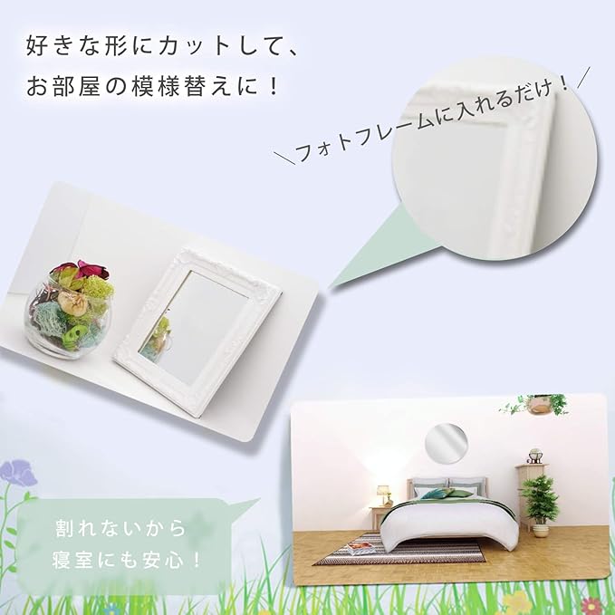 利点は安全性に優れているところです。アクリル鏡のように割れることはありません。災害時にも割れる心配がないため、お子様やご年配のお部屋にもおすすめ致します。