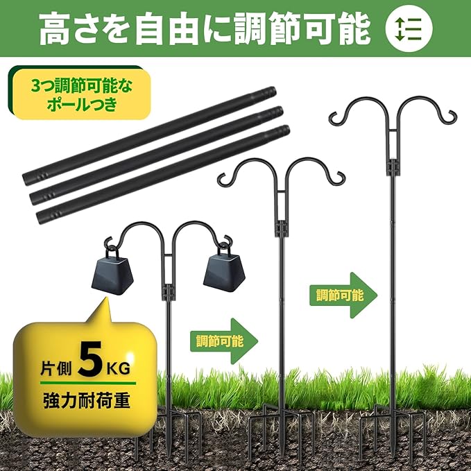 バードフィーダースタンドは、グリーンのハンギングスペースを作るのにピッタリ。太い柱、5ポイントのシェパードフックで土をしっかりグリップ。重量のあるプランターや照明器具を吊るしても抜群の安定感。