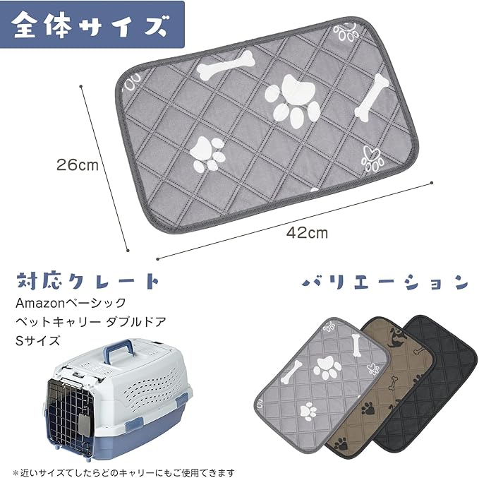 クレートマットサイズ:42 26cm;対応商品:ベーシック ペットキャリー ダブルドア Sサイズ 48.26 x 32x 25.4cm(L W H);近いサイズでしたらどのキャリーにもご使用できます